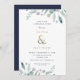 Affordable custom printed wedding rehearsal dinner invitations personalised with your event details. This elegant design features a faux gold foil ampersand with delicate blue and green watercolor foliage on a white background. Use the design tools to customise the text, edit the fonts and colours or add your own photos to create a modern minimalist party invitation.