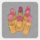 A collection of pretty lipsticks on a backdrop of stylised kiss pattern.