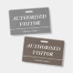 This respectable badge design features the message "AUTHORISED VISITOR", and a customisable company name or other custom message. A badge like this could be used to indicate that a visitor or guest at a workplace is allowed to be there. [~Z0000307]