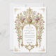 Invite your guests to a wedding of unparalleled elegance with this exquisite wedding invitation. This design showcases a lavish Baroque-inspired aesthetic, featuring an intricate gilded gold framework adorned with scrolling acanthus leaves, ornate flourishes, and two prominent golden urns. These urns, and the climbing vines, overflow with a breathtaking arrangement of classic garden flowers. Sumptuous pink roses and peonies, in shades from soft blush to deep rose, take centre stage, complemented by delicate peach and apricot roses. Accents of small, charming light blue flowers, possibly cornflowers or forget-me-nots, and smaller pink blossoms add depth and texture. Lush green foliage provides a rich background to the floral display. The artwork evokes the opulence of European palaces and fine botanical illustrations, with a central cartouche at the base perfect for a custom monogram. The main invitation panel elegantly displays your wedding information within this magnificent floral frame. This luxurious design is perfect for a grand, traditional, or fairytale wedding.