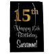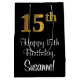 This elegant, luxurious, and stylish birthday themed gift bag design features a large ordinal number “15th” having a faux/imitation gold-inspired gradient pattern, along with the birthday greeting message “Happy 15th Birthday,” and a personalised recipient name in a script-style font. The background is coloured black. A gift-bag like this might be used when wrapping gifts being given to somebody in celebration of their fifteenth birthday. [~Z0000514]