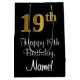 This stylish, sophisticated, and luxurious birthday giftbag design features a large ordinal number “19th” having an imitation/faux gold-like appearance, in addition to the birthday greeting message “Happy 19th Birthday,” and an editable recipient name in a script-style font. It also has a black-coloured background. A stylish birthday themed gift bag like this might be a fun way to wrap a gift or present being given to celebrate somebody’s 19th birthday. [~Z0000514]