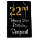 This sophisticated, luxurious, and stylish birthday themed giftbag design features a large ordinal number “22nd” having an imitation/faux gold-like look, along with the birthday greeting message “Happy 22nd Birthday,” and a custom recipient name in a script-style font. It also has a black-coloured background. A birthday themed gift-bag like this might be a fun way to wrap a gift or present being given to somebody who is celebrating their twenty second birthday. [~Z0000514]