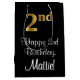 This elegant, stylish, and sophisticated birthday-themed gift bag design features a large ordinal number “2nd” having a faux/imitation gold-like gradient pattern, along with the birthday greeting message “Happy 2nd Birthday,” and a personalised recipient name in a script-style font. It also has a black-coloured background. A stylish birthday themed gift bag like this might be used when giving a gift or present in celebration of somebody’s 2nd birthday. [~Z0000514]