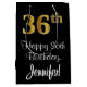 This luxurious, elegant, and sophisticated birthday themed gift bag design features a large ordinal number “36th” having an imitation/faux gold-inspired appearance, plus the birthday greeting message “Happy 36th Birthday,” and a personalised recipient name in a script-style font. The background is coloured black. A birthday themed gift-bag like this might be a fun way to wrap a gift or present being given to celebrate somebody’s thirty sixth birthday. [~Z0000514]