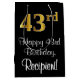 This luxurious, elegant, and sophisticated birthday giftbag design features a large ordinal number “43rd” having a faux/imitation gold-inspired appearance, plus the birthday greeting message “Happy 43rd Birthday,” and a customisable recipient name in a script-style font. The background is coloured black. A gift bag like this might be used when giving a gift or present in honour of somebody’s forty third birthday. [~Z0000514]