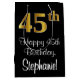 This luxurious, elegant, and stylish birthday-themed giftbag design features a large ordinal number “45th” having an imitation/faux gold-inspired look, in addition to the birthday greeting message “Happy 45th Birthday,” and an editable recipient name in a script-style font. The background is coloured black. A luxurious birthday themed gift bag like this might be a fun way to wrap a gift or present being given to somebody who is celebrating their 45th birthday. [~Z0000514]
