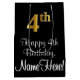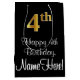 This sophisticated, stylish, and elegant birthday gift bag design features a large ordinal number “4th” having an imitation/faux gold-like appearance, plus the birthday greeting message “Happy 4th Birthday,” and a personalised recipient name in a script-style font. The background is coloured black. A stylish birthday themed gift bag like this might be used when giving a gift or present in celebration of somebody’s 4th birthday. [~Z0000514]