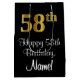 This elegant, stylish, and sophisticated birthday-themed giftbag design features a large ordinal number “58th” having a faux/imitation gold-like look, along with the birthday greeting message “Happy 58th Birthday,” and a customisable recipient name in a script-style font. The background is coloured black. A birthday themed gift bag like this might be a fun way to wrap a gift or present being given to somebody who is celebrating their fifty eighth birthday. [~Z0000514]