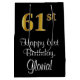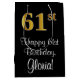 This elegant, luxurious, and sophisticated birthday giftbag design features a large ordinal number “61st” having a faux/imitation gold-inspired appearance, plus the birthday greeting message “Happy 61st Birthday,” and a custom recipient name in a script-style font. It also has a black-coloured background. A gift bag like this might be used when wrapping gifts being given to somebody in celebration of their 61st birthday. [~Z0000514]