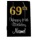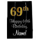 This stylish, sophisticated, and elegant birthday-themed gift bag design features a large ordinal number “69th” having an imitation/faux gold-like look, along with the birthday greeting message “Happy 69th Birthday,” and a customisable recipient name in a script-style font. The background is coloured black. A luxurious gift-bag like this might be used when wrapping presents being given to somebody in celebration of their 69th birthday. [~Z0000514]