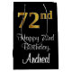 This stylish, sophisticated, and elegant birthday themed gift bag design features a large ordinal number “72nd” having an imitation/faux gold-inspired gradient pattern, plus the birthday greeting message “Happy 72nd Birthday,” and a custom recipient name in a script-style font. It also has a black-coloured background. A luxurious birthday themed gift bag like this might be used when giving a gift or present in celebration of somebody’s 72nd birthday. [~Z0000514]