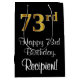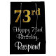 This stylish, sophisticated, and elegant birthday-themed giftbag design features a large ordinal number “73rd” having an imitation/faux gold-inspired gradient pattern, along with the birthday greeting message “Happy 73rd Birthday,” and a custom recipient name in a script-style font. The background is coloured black. An elegant gift-bag like this might be used when wrapping presents being given to somebody in celebration of their seventy third birthday. [~Z0000514]