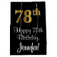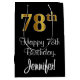 This sophisticated, elegant, and luxurious birthday-themed gift bag design features a large ordinal number “78th” having a faux/imitation gold-inspired appearance, in addition to the birthday greeting message “Happy 78th Birthday,” and an editable recipient name in a script-style font. It also has a black-coloured background. A stylish birthday themed gift bag like this might be a fun way to wrap a gift or present being given to celebrate somebody’s 78th birthday. [~Z0000514]