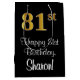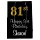 This sophisticated, elegant, and stylish birthday-themed giftbag design features a large ordinal number “81st” having an imitation/faux gold-like gradient pattern, in addition to the birthday greeting message “Happy 81st Birthday,” and a custom recipient name in a script-style font. It also has a black-coloured background. A stylish gift bag like this might be a fun way of wrapping a birthday present or gift being given to somebody who is celebrating their eighty first birthday. [~Z0000514]