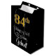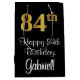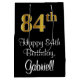 This sophisticated, luxurious, and elegant birthday themed gift bag design features a large ordinal number “84th” having a faux/imitation gold-inspired appearance, along with the birthday greeting message “Happy 84th Birthday,” and an editable recipient name in a script-style font. The background is coloured black. A luxurious birthday themed gift bag like this might be used when giving a gift or present in celebration of somebody’s 84th birthday. [~Z0000514]