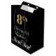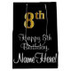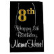 This elegant, sophisticated, and luxurious birthday themed gift bag design features a large ordinal number “8th” having an imitation/faux gold-like appearance, in addition to the birthday greeting message “Happy 8th Birthday,” and a custom recipient name in a script-style font. The background is coloured black. A birthday themed giftbag like this might be used when giving a gift or present in celebration of somebody’s 8th birthday. [~Z0000514]