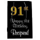 This stylish, sophisticated, and elegant birthday themed gift bag design features a large ordinal number “91st” having an imitation/faux gold-inspired appearance, plus the birthday greeting message “Happy 91st Birthday,” and a personalised recipient name in a script-style font. It also has a black-coloured background. A birthday themed gift bag like this might be a fun way to wrap a gift or present being given to somebody who is celebrating their ninety first birthday. [~Z0000514]