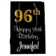 This stylish, sophisticated, and elegant birthday gift bag design features a large ordinal number “96th” having an imitation/faux gold-like look, in addition to the birthday greeting message “Happy 96th Birthday,” and an editable recipient name in a script-style font. The background is coloured black. A gift bag like this might be used when wrapping gifts being given to somebody in celebration of their 96th birthday. [~Z0000514]