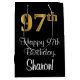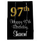 This elegant, luxurious, and stylish birthday-themed giftbag design features a large ordinal number “97th” having a faux/imitation gold-like appearance, in addition to the birthday greeting message “Happy 97th Birthday,” and a custom recipient name in a script-style font. The background is coloured black. A gift bag like this might be used when giving a gift or present in honour of somebody’s 97th birthday. [~Z0000514]