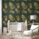 Transform your space with our luxurious peel and stick wallpaper featuring golden palm fronds. The lush palm leaves are meticulously detailed, capturing the natural beauty of each frond. Metallic gold tones contrast beautifully against the deep green background. Create an accent wall or cover an entire room for a touch of tropical sophistication.