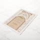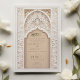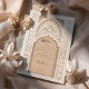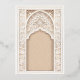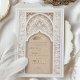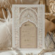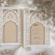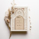 This luxurious wedding invitation is a perfect blend of traditional Islamic art and modern elegance. The front of the invitation features an intricate gold and ivory floral pattern, delicately framing the text in both Arabic and English. The beautiful arch design, adorned with detailed floral motifs and geometric patterns, exudes a sense of grandeur and sophistication. The back of the invitation continues this theme with a soft beige background, highlighted by an ornate, embossed floral design that adds texture and depth. Ideal for a grand and elegant wedding, this invitation is sure to leave a lasting impression on your guests.