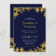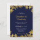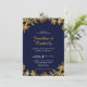 This luxurious wedding invitation features an elegant navy background adorned with sophisticated gold floral borders. The formal design exudes a timeless charm, perfect for an evening wedding celebration. The invitation uses classic calligraphy fonts and includes detailed event information. Ideal for a cathedral wedding, this invitation sets a refined tone for the special day. Guests will appreciate the clear and elegant presentation, ensuring they have all the necessary details for the ceremony and the reception to follow.