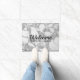 Luxurious white marble stone print welcome sign door mat. Make your own personalised indoor or outdoor doormat with custom background. Add your own welcome message, business name, family surname, initial letters or funny quote. Luxury gift idea for new home, office, relocation, store, sports shop, company, business, club, wedding party venue etc. Personalizable template with script typography. Create your own fancy entry mat, rug for front door, entryway or hall. Customisable home decor and decorations for your house. Black and white pattern design with black text.