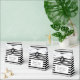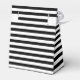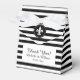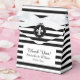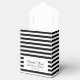 Luxury black and white striped wedding party favour box. Fleur de lis icon with personalised text thanking guests. Custom thank you message from bride and groom. glamourous lines print with elegant white ribbon bow. Customisable background colour. Lxurious theme design with date of marriage. Tent box ideas for your marriage.