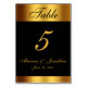 This elegant personalised wedding table number card feature the table number in faux gold script calligraphy with the bride and grooms names and wedding date on a black background bordered with shiny gold. Designed by Susan Coffey.