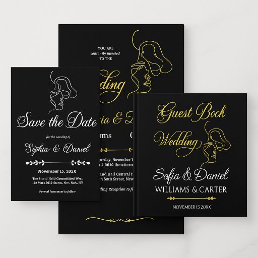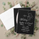 Elegant black and white wedding card featuring a minimalist line art illustration and refined typography. The bold black background with white text creates a sophisticated and timeless look, ideal for luxury, black-tie, or modern weddings. Romantic calligraphy for the first names paired with classic serif fonts for the last names adds both charm and readability. Fully customisable — personalise names, date, time, and venue for your special celebration. Perfect for couples seeking a chic and artistic stationery style.
