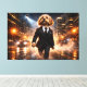 Set within a dramatic nighttime cityscape, this piece features a sharply dressed Cockapoo walking with confidence through a rain-lit street — surrounded by lights, reflections, and a powerful sense of movement.
