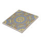 This ceramic tile exudes a blend of traditional elegance and modern sophistication. The tile is adorned with an intricate, symmetrical pattern featuring golden embellishments that beautifully contrast against the muted grey background. At the centre of the tile, a radiant sun-like motif acts as the focal point, surrounded by graceful curves and flourishes that extend towards the edges. This central design is echoed in each corner of the tile, albeit in a smaller size, creating a harmonious visual balance. The golden patterns exhibit a metallic sheen, offering a luxurious aesthetic against the matte background.