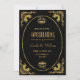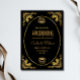 These glamourous wedding invitations feature a modern and semi-classic art. An ornate, gold flower art frame and ornamentation decorate an elegant dark onyx-black background for a dramatic, vintage wedding look.
