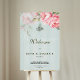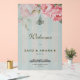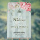 This luxury floral wedding welcome sign is printed on the backside of clear acrylic, allowing light to pass through the design and create a soft, luminous depth. Delicate blush peonies, subtle vertical paneling, and refined Arabic script come together in a composition that feels calm, ceremonial, and timeless.