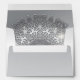 Elegant stylish envelope design featuring a shiny silver metallic filigree floral mandala on a sliver background.