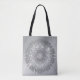 Elegant stylish tote bag design featuring a shiny silver metallic filigree floral mandala on a sliver background.