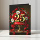 The card front features a dramatic, dark background showcasing a lavish bouquet of red and white gerbera daisies in a classic gold vase. A prominent, metallic gold '25' is framed by a ruby-red ribbon banner that currently reads "Happy Anniversary!".