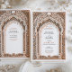 This exquisite wedding invitation features a breathtaking gold filigree arch, inspired by classic baroque and Indian palace architecture. The intricately carved floral and scrollwork detailing creates a regal and sophisticated ambiance, making it perfect for elegant, traditional, and destination weddings. The luxurious gold and ivory colour palette enhances the timeless aesthetic, while the refined typography ensures a harmonious blend of artistry and elegance. Ideal for couples seeking an opulent and memorable wedding invitation that exudes grandeur and sophistication.
