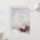 Invite your guests to a celebration of ethereal romance and coastal beauty with this exquisite wedding invitation. The design centers on a stunning central thin gold circular frame set against a luminous soft ivory and pale pink backdrop. The base features a stylized beach or waterscape, with soft waves meeting sand, all enveloped in a coastal mist. The lower portion of the frame is gorgeously accented by a lush cluster of white, lavender, and soft pink flowers and feathery dried foliage. The top is anchored by an ornate baroque gold crest with pearl accents. This aesthetic beautifully merges the seaside atmosphere with rich, opulent metallic accents, perfectly setting the stage for a luxurious, beach, or destination wedding. This invitation card is ideally suited for a coastal or beach wedding, a chic formal engagement celebration, or an elegant seaside party. It would also perfectly suit a sophisticated vow renewal ceremony or a serene, pastel-themed celebration. The card's captivating blend of ornate gold accents and ethereal florals ensures it is versatile for any solemn ceremony, corporate gala, or refined birthday announcement.