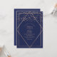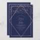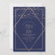 Introducing our exquisite and contemporary wedding invitation, designed to elevate your upscale and sophisticated celebration. Adorned with a faux-printed, radiant gold glitter confetti, delicately scattered atop a sleek gold geometric diamond motif, all set against a backdrop of rich navy blue with a gilded rectangular border. This invitation exudes chic opulence, subtle elegance, and modern flair, making it the ultimate choice to capture the essence of your extraordinary day.
