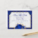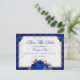 Roses speak of love, so let these gorgeous blue roses cushioned on white satin framed by gold filigree, elegantly announce your upcoming wedding date. The text can easily be personalised, and the background is simulated royal blue metallic to enhance the luxury. Check out the rest of the elegant royal blue and gold floral wedding suite in the collection.