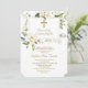 Elegant card design featuring watercolour delicate white, cream flowers frame, a faux gold cross; on the back floral divider, floral bouquet and initials, on a white background. On the back white flowers bouquet. Use Personalise tool to add your info, change fonts, font's colours. For matching items, please, visit my Holy Communion Collection.