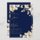 Luxury white gold floral navy blue Wedding invitations timeless blend of elegance and sophistication, this white and gold floral wedding invitation features delicate botanical accents and shimmering metallic details. The refined navy blue backdrop highlights the intricate gold foiling, creating a radiant and romantic impression. Perfect for couples seeking a classic yet opulent design, it sets the tone for an unforgettable celebration. Exquisite craftsmanship ensures every card feels as special as your day.