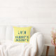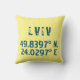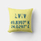Modern throw pillow design features latitude and longitude coordinates for Lviv, Ukraine in distressed dark blue font on yellow background