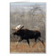 Bull Moose card vertical. A big bull moose lumbers through the scrub brush in a sand hills area of southern Alberta, Canada. Moose seem out of place in this dry, sandy terrain that has very little water to support the aquatic vegetation moose usually feed on.