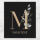 Letter M monogram floral. Letter M in golden brown texture accented with green watercolor compound leaves, flower blossoms and gold dust. Personalise with name in matching font.