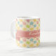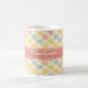 This bright and colourful illustration of doodled macarons with hearts makes for a charming gift. The macarons are hand drawn and coloured pink, purple, blue, yellow and green with little hearts floating between them. This cheery seamless pattern is very stylish and is a sure mood lifter. This would make a very lovely and thoughtful gift to anyone who has a love for the delicious French macaroons! Give it the perfect personal touch by customising it with a name or text. The text will be added to the decorative ribbon in matching maroon and cream colour.