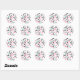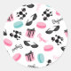A sticker featuring a pattern of blue and pink French macarons, black poodles, cat eye sunglasses, pink gift boxes tied with a black ribbon, and "Bonjour!"