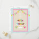A birthday postcard invitation featuring an illustration of a French macarons and two cups of tea with lemon. Bunting at top. Background is blue gingham. Personalise all text.